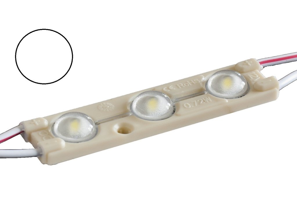 Univerzální LED modul pro všestranné použití. Jeden z nejoblíbenějších LED modulů současnosti. Rozptylová čočka umožňuje jeho použití v mělkých světelných boxech aniž by byly patrné jednotlivé svítící body LED čipů. Minimální hloubka boxu závisí na optických vlastnostech materiálu, který je prosvětlován a zpravidla je nutné optimální (minimální) vzdálenost modulu od prosvětlované plochy prakticky vyzkoušet. Výborný poměr cena/výkon(vlastnosti) modul předurčuje k použití ve většině běžných ale i náročnějších aplikací.