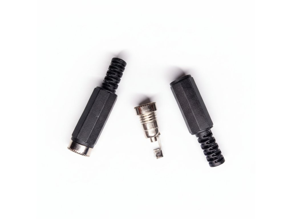 Konektor - zásuvka umožňuje připájení dvojlinky. Jedná se o protikus běžného konektoru napájecích adaptérů 5,5/2,1mm.